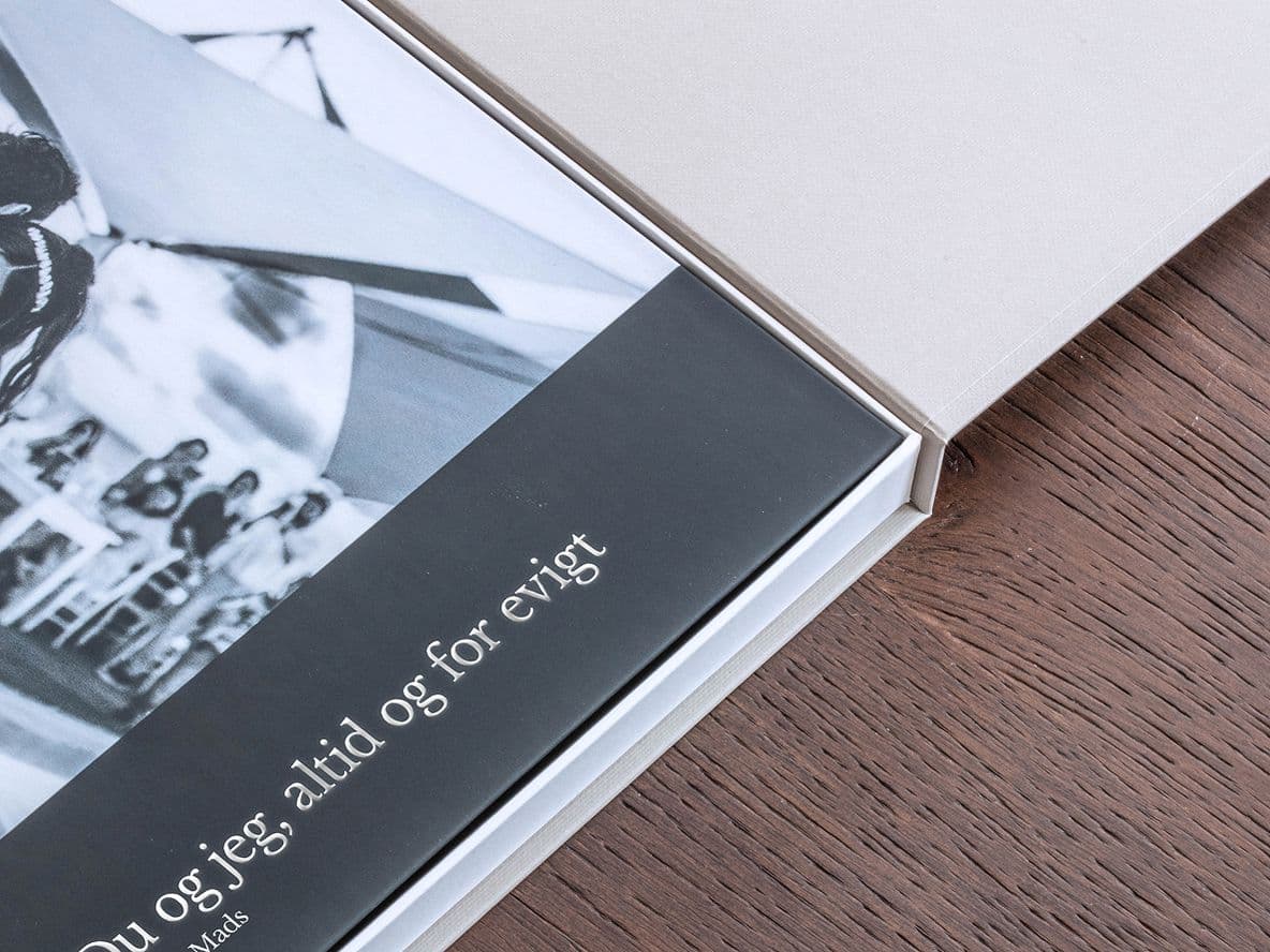 Giv din bryllupsdagsgave et løft med gyldne eller sølvfarvede bogstaver på forsiden og ryggen af din fotobog.