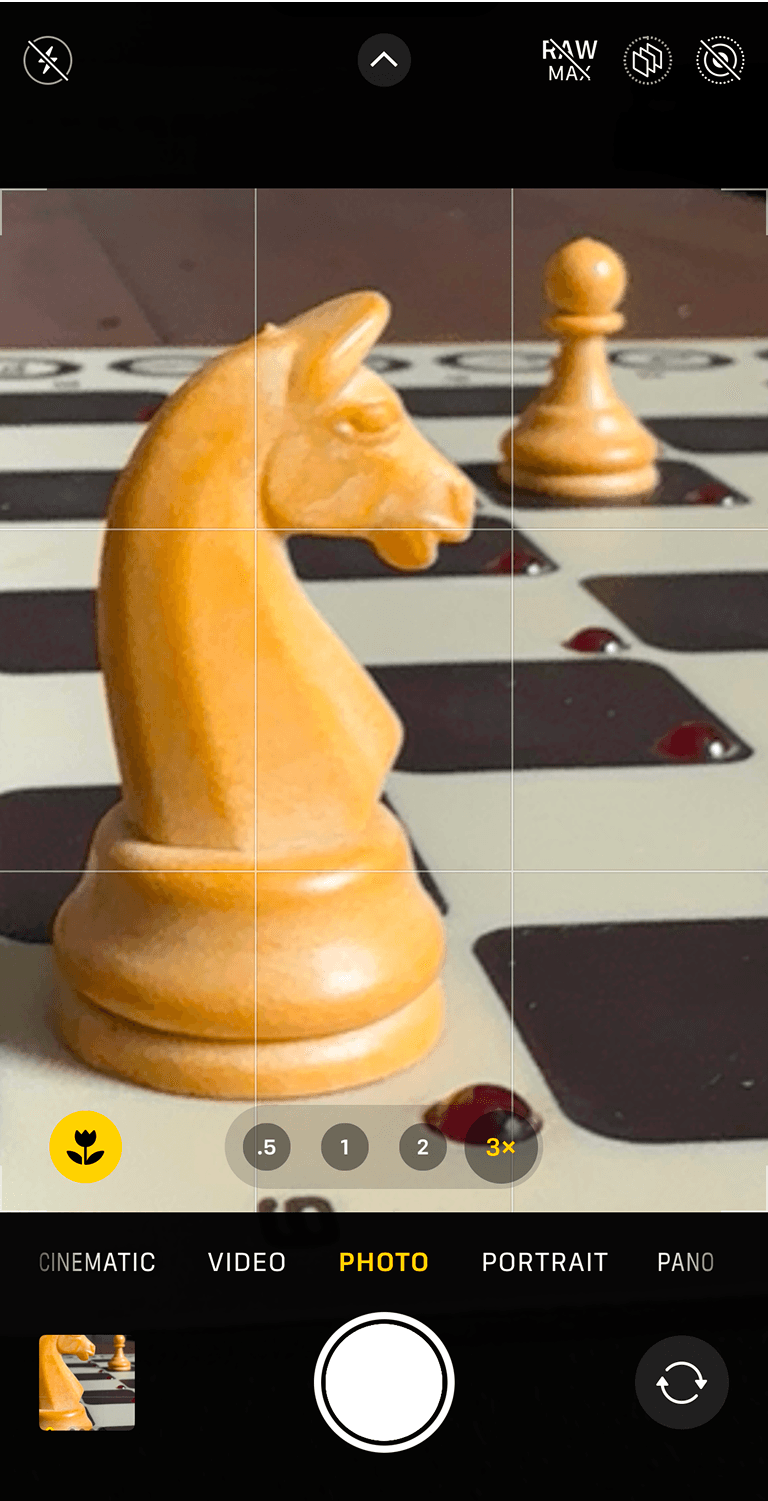 Verwende den Nahaufnahmemodus des iPhones, indem du in den Fotomodus wechselst und auf das Makro-Symbol in der unteren linken Ecke des Bildschirms tippst
