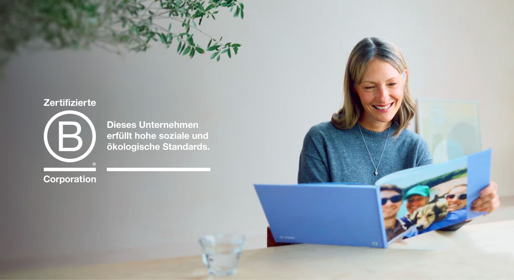 Ein B Corp-Unternehmen zu sein bedeutet, eine Gemeinschaft aus Unternehmen, Kund:innen und Stakeholdern zu schaffen, die an einen besseren Weg in die Zukunft glauben. Ihre Unterstützung ermöglicht es uns, weiterhin innovativ zu sein, weiter CO2-Ausgleichszahlungen leisten und weiter nach neuen Wegen suchen zu können, die unsere Auswirkungen auf den Planeten zu reduzieren, während wir gleichzeitig die Aufbewahrung von Erinnerungen so mühelos wie möglich gestalten.