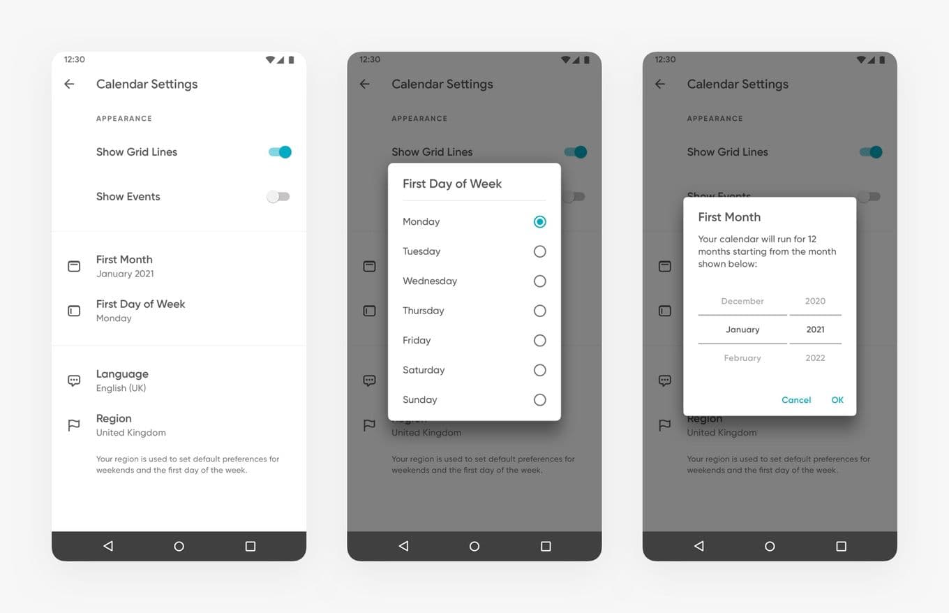 Each mode triggers a different bit of temporal logic depending on the user preference. For example, grid formats require dates to be dynamically offset from the first element in the grid depending on the day of the week the month starts on.
