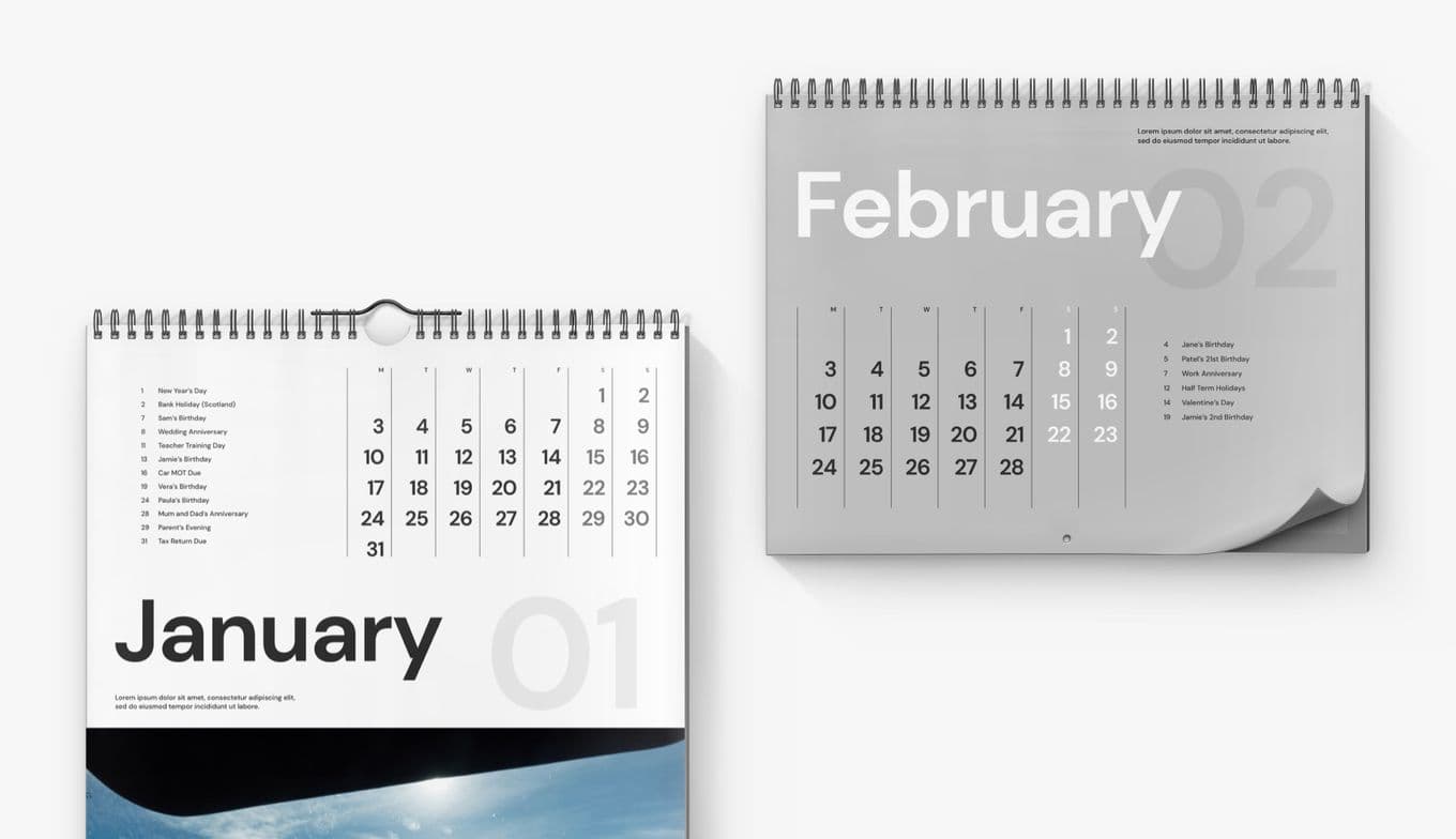 For Calendars we studied the physical mechanisms in great detail, faithfully recreating the ring binding, hanging bar, shadows against the wall and a sense of gravity as each page falls.