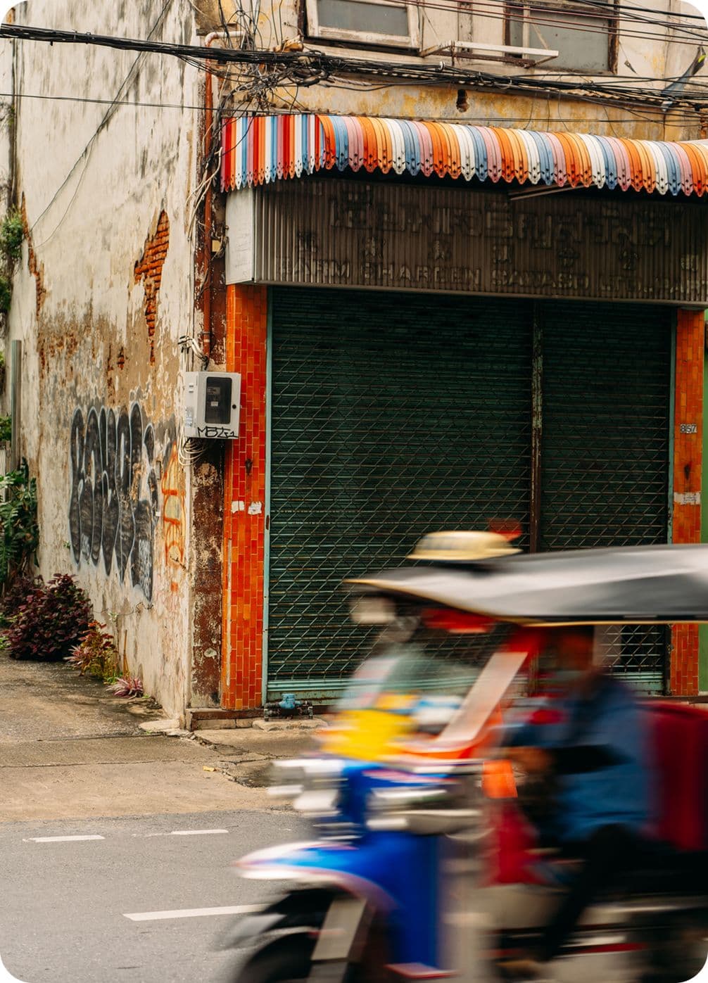 When I started out, I thought all good photographs had to be tack-sharp, with perfectly straight verticals and level horizons. Bangkok quickly taught me otherwise. To truly capture the city’s soul, I had to embrace its imperfections. Low shutter speeds are a great way to reveal its energy. Instead of freezing tuk-tuks and pedestrians mid-motion, try an exposure around 1/20 to blur their movement into colourful streaks. Alternatively, moving your camera during a shot (a technique called shutter dragging) adds a spontaneous, painterly feel.